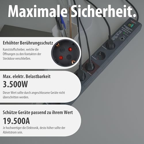 Schützt wertvolle Geräte vor Überspannungen mit einem max. Ableitstrom bis zu 19.500A (Schutz bei Gewitter, Blitzschlag, etc.)